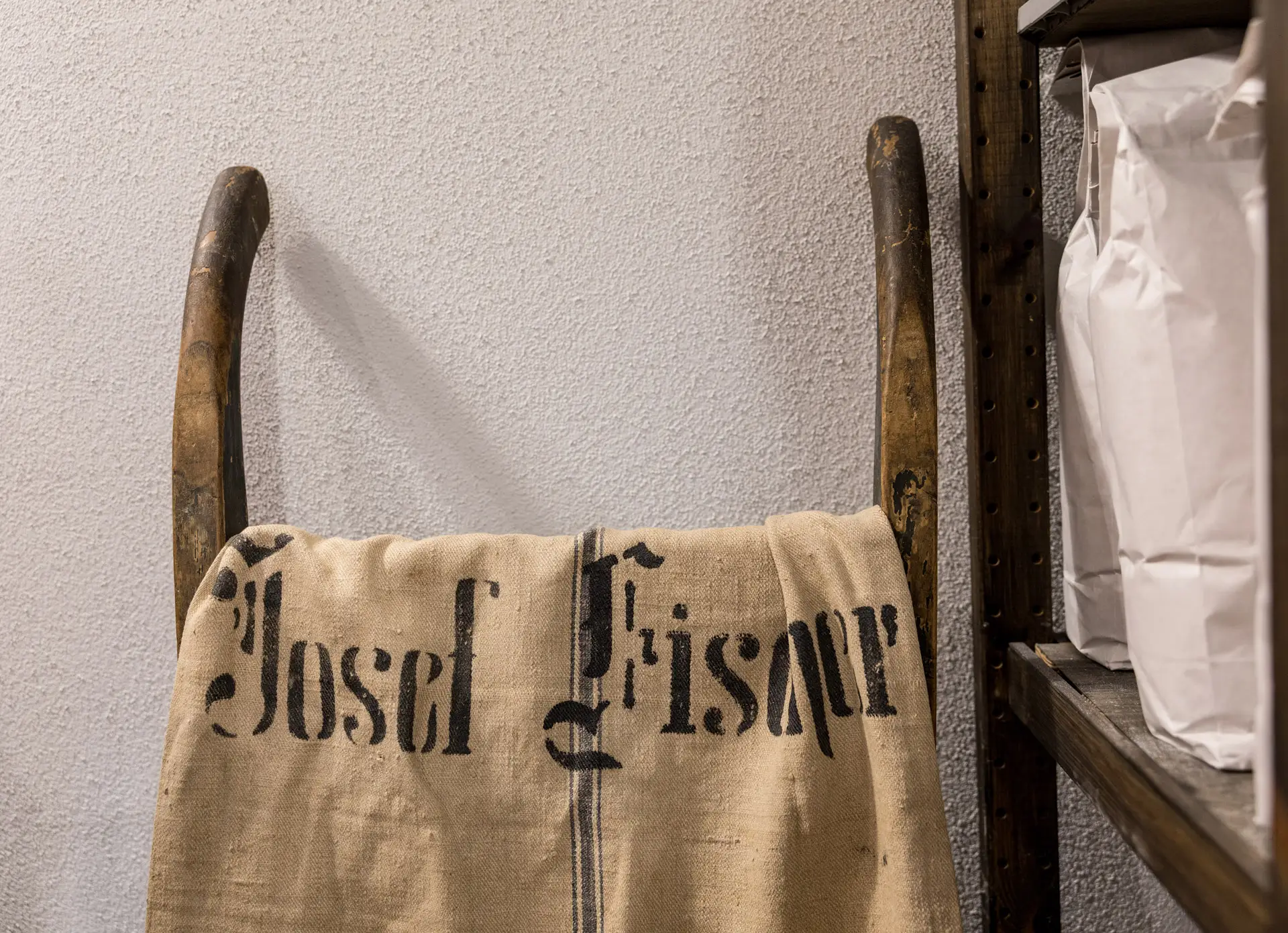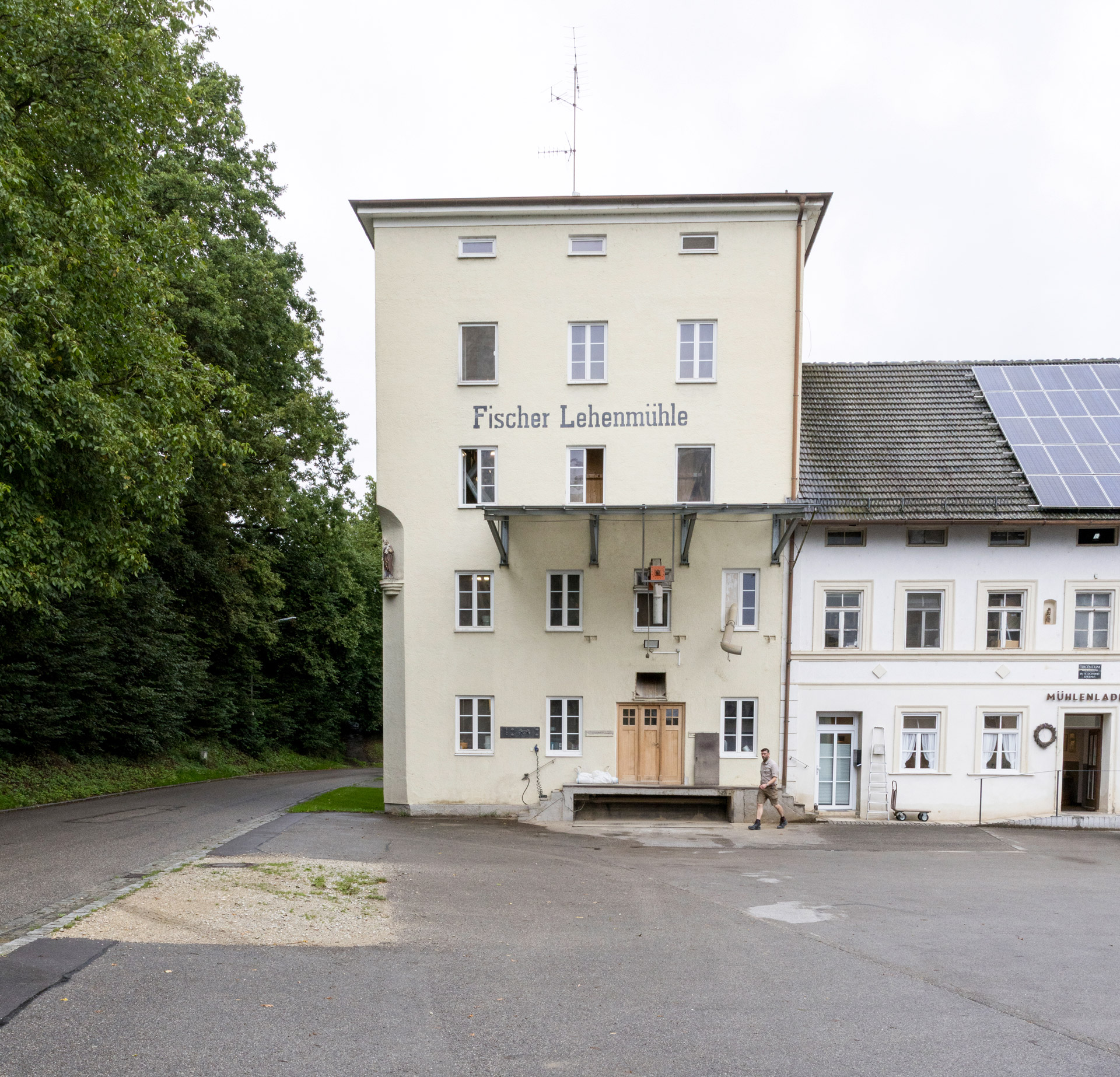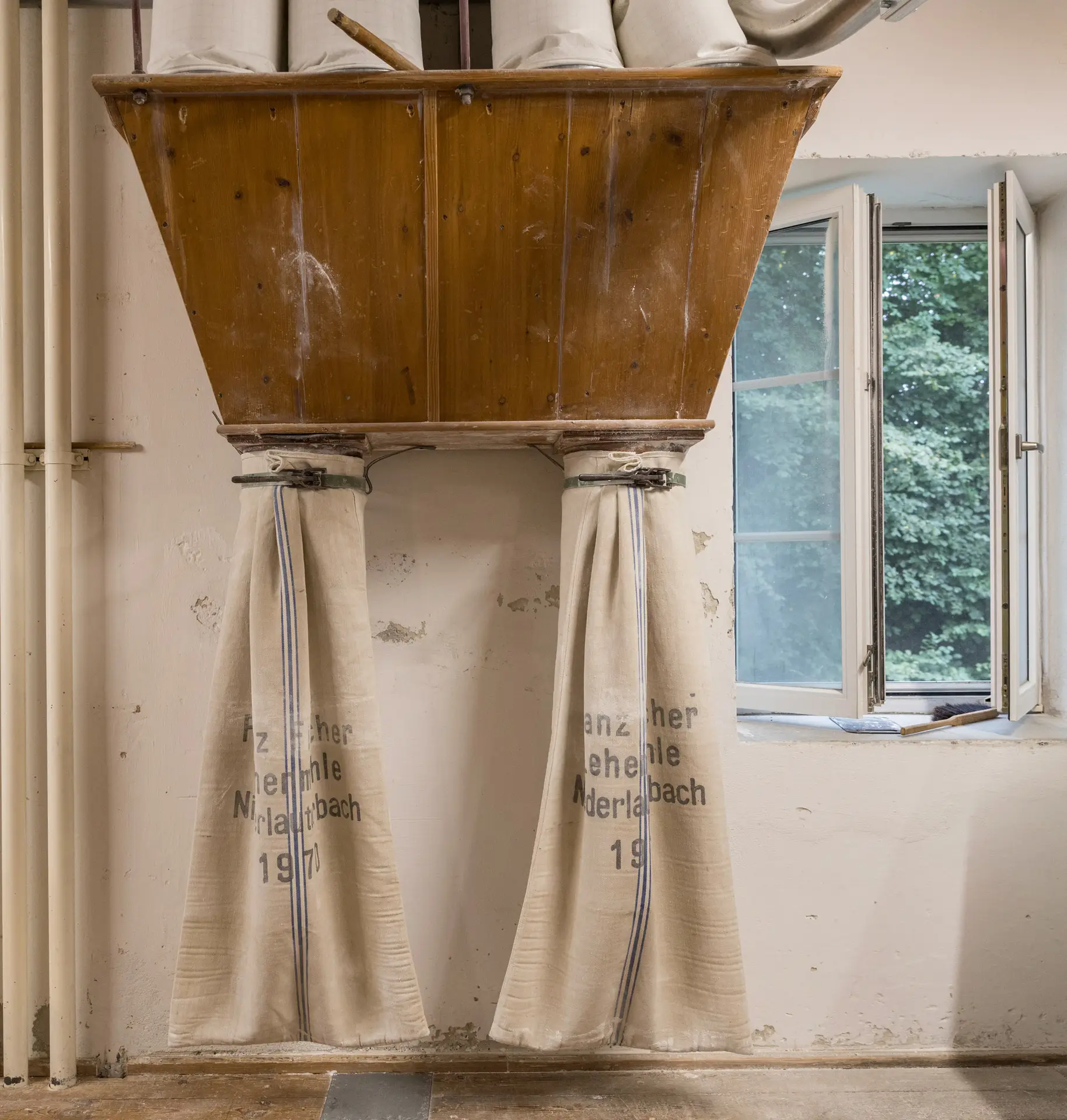 Das Alte und Das Neue: Man läuft Gefahr, sich in einem Betrieb wie der Lehenmühle zu verlieren, in dem beides neben- und miteinander existiert und sich gegenseitig unterstützt. Das Alte: Ein Rohrgewirr durchzieht das Mühlengebäude und wird eingerahmt von uralten Mahlstühlen oder hölzernen Trichtern, an denen grau gewordene Jutesäcke mit der Aufschrift „Franz Fischer Lehenmühle 1970“ hängen. Daneben liegt unter einem geöffneten Fenster ein kleiner Besen, der ohne den heute allgegenwärtigen Kunststoff auskommt und in dieser Form auch schon vor vielleicht einhundert Jahren von Besenbindern angeboten wurde. Wenige Sekunden vorher gefüllte Mehlsäcke kommen auf einer alten hölzernen Rutsche eine Etage tiefer an, landen auf einer Schulter und werden händisch auf Paletten gestapelt. Es scheint, als wäre die Produktion von Mehl ein ewiges Auf und Ab, in dem Getreidekörner, die Varianten Schrot, Grieß und Dunst, die gebrauchsfertigen Mehle und am Ende das Futtermittel Kleie (das sind die übrig gebliebenen Schalen) die verschiedenen Etagen in dem fünfstöckigen Mühlengebäude mal nach oben und dann wieder nach unten durchwandern. „Mühlengebäude sind hoch, damit das Getreide frei fallen kann“, erklärt Franz-Josef Fischer, und er erklärt auch, was wohin fällt – es ist verwirrend. Was aber nicht an den geduldigen Erläuterungen des Müllers liegt; es ist vielmehr ein Gefühl, das an diese unguten Momente in der Schulzeit erinnert: zu viel neuer Stoff heute.