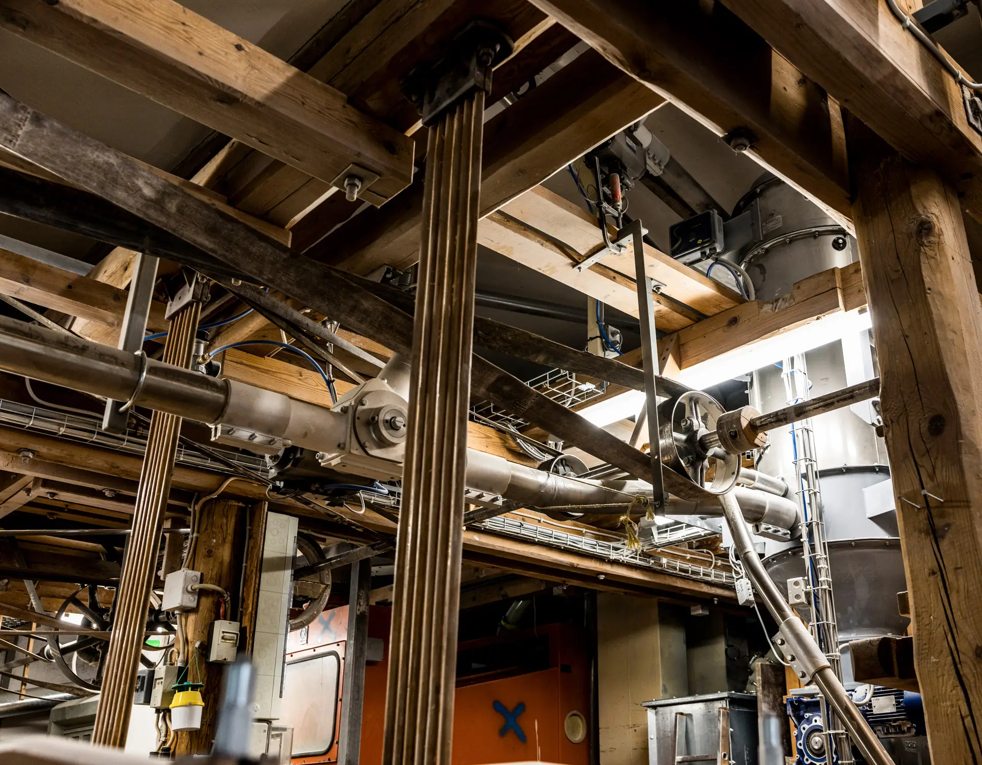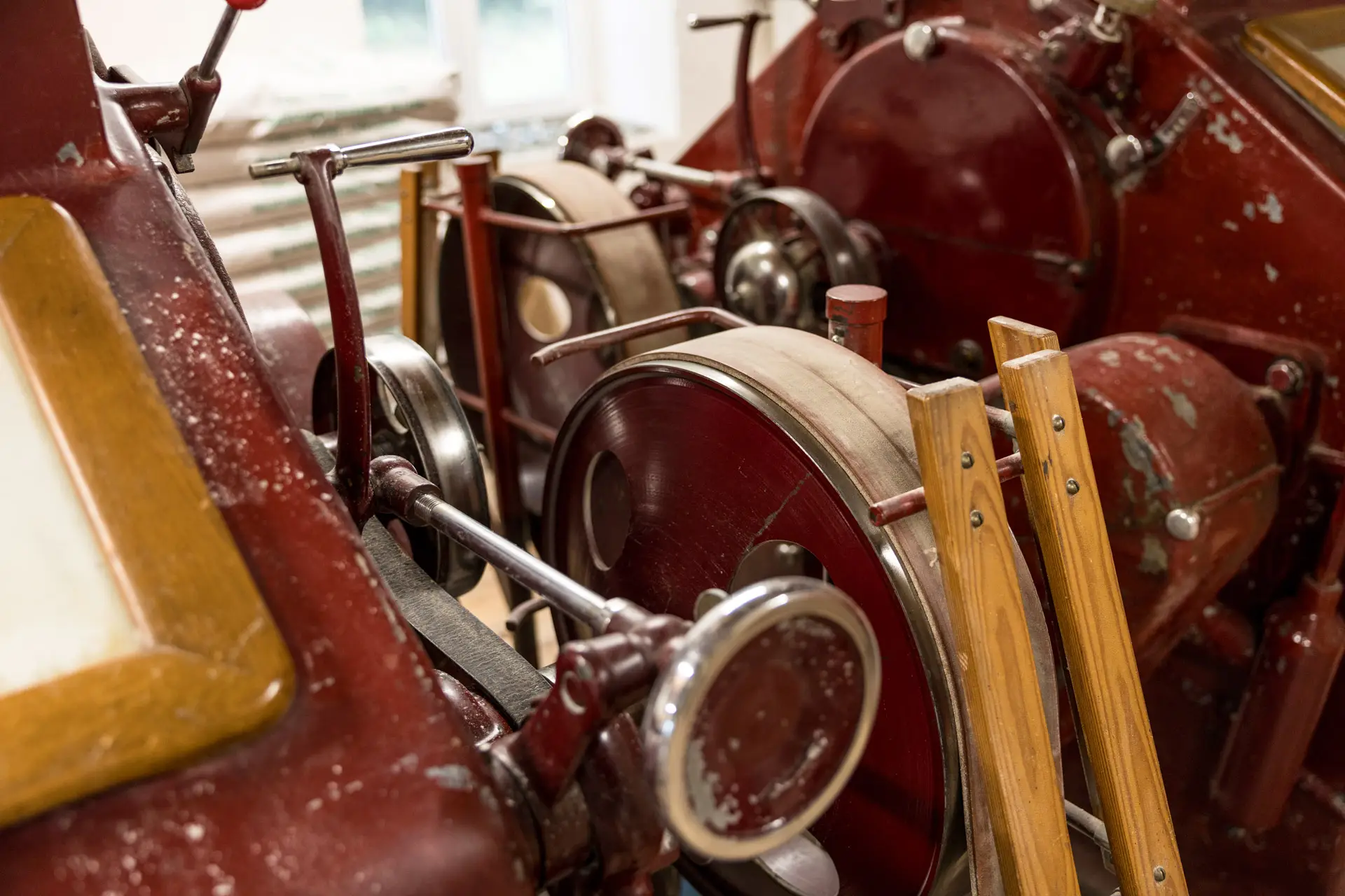 Die Mahlstühle stammen aus der Nachkriegszeit, ein Schild mit gelber Grundierung weist darauf hin, dass die mechanischen Geräte von „Hipkow Zündapp“ hergestellt wurden. Das stilisierte Z darunter lässt sich nicht missverstehen, schließlich fuhr der Jugendfreund vor vielen Jahren eine 50er Kreidler und hatte sich damit gegen eine Zündapp entschieden. Recht viel mehr gab es nicht, ehe japanische Marken den Markt übernahmen. Aber was bitte hat ein Motorrad- oder später Mopedhersteller mit Mahlstühlen für Müller zu tun? Franz-Josef Fischer hat selbstverständlich auch auf diese Frage eine Antwort. In den Nachkriegsjahren hatte Zündapp Absatzschwierigkeiten und andererseits waren viele Unternehmen, die für die Lebensmittelbranche arbeiteten, während der Kriegsjahre aus strategischen Gründen ausgebombt worden. Insofern gab es neue Allianzen, in diesem Fall hatte Zündapp wohl die Produktionskapazitäten, um das Nachfragetief bei Motorrädern einige Jahre lang mit der Gemeinschaftsproduktion von Mahlstühlen auszugleichen. Später fokussierte sich das Unternehmen wieder auf Zweiräder. Die alten Mahlstühle aus der Motorradfabrik, die unterschiedlich eingestellt sind und vom Getreide beziehungsweise Mehl in den verschiedenen Mahlgraden mehrmals durchlaufen werden (wobei die Kombination aus Mahlen und Sieben als „Passage“ bezeichnet wird), müssen zwar gewartet werden, wirken aber unverwüstlich. Zum Teil werden sie noch mit Lederriemen angetrieben, so wie in der Frühzeit der Industrialisierung, als in vielen Betrieben ein großer Elektromotor über ein ausgeklügeltes System mit Wellen und Riemenscheiben viele Maschinen versorgte.